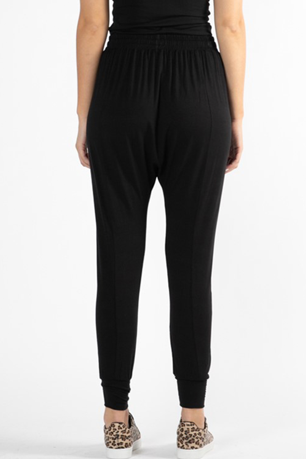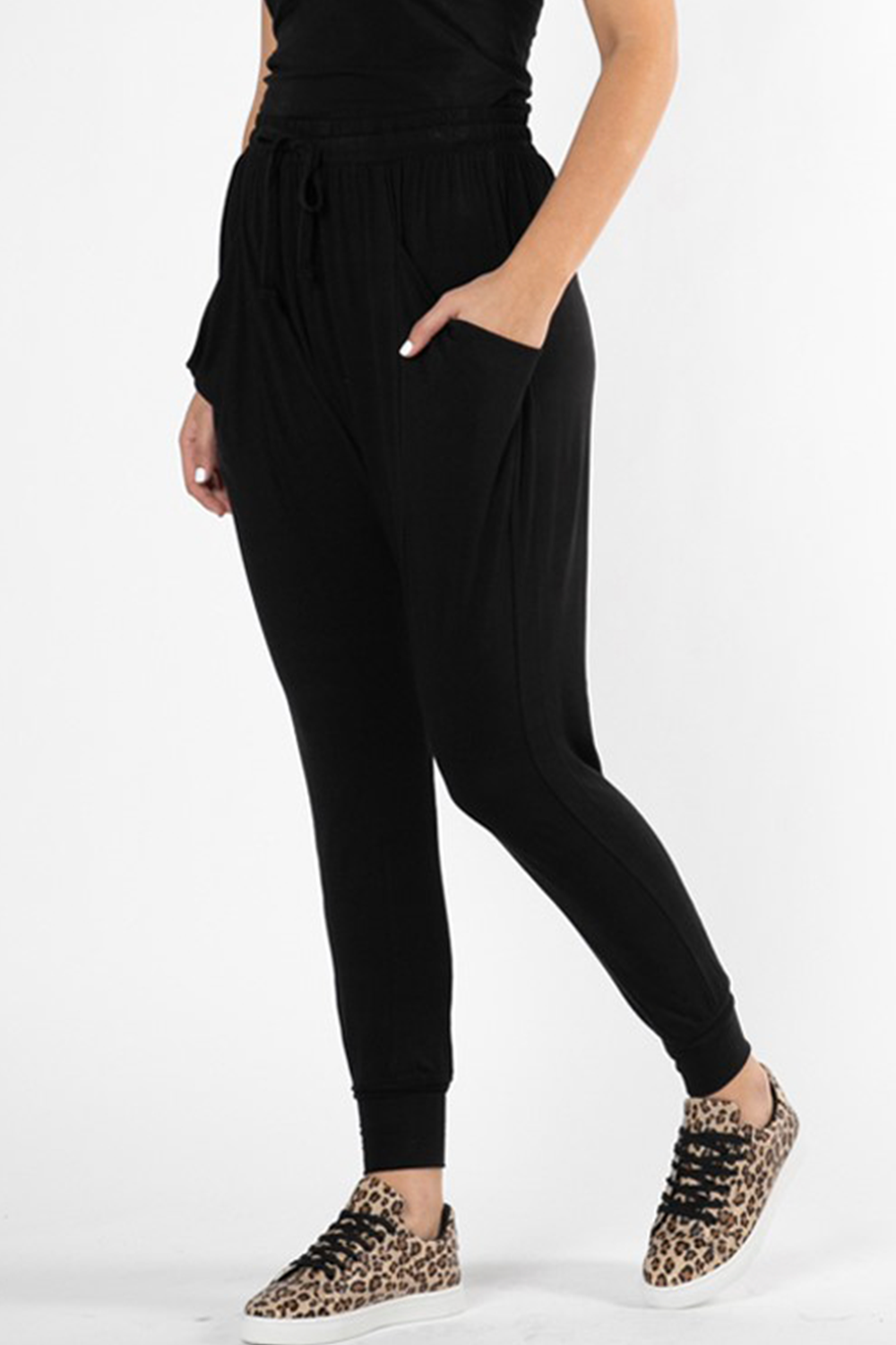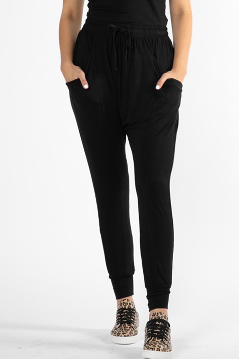 light weight stretch fabric. dropped crotch. tapered leg with band at hemline. wear full length or pull up to 3/4 length.. elasticated waistline with drawstring. functional side pockets.