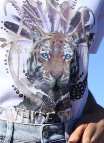 – Standard fit – Hand beaded embellishments over a native tiger – Pair with jeans and sneakers or wet look pants and heels! Fabric – 95% cotton 5% spandex